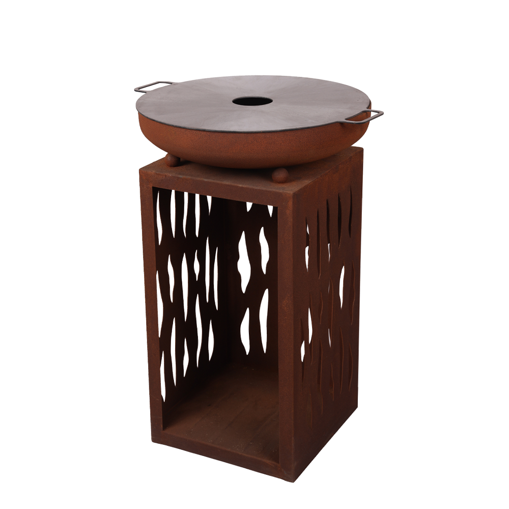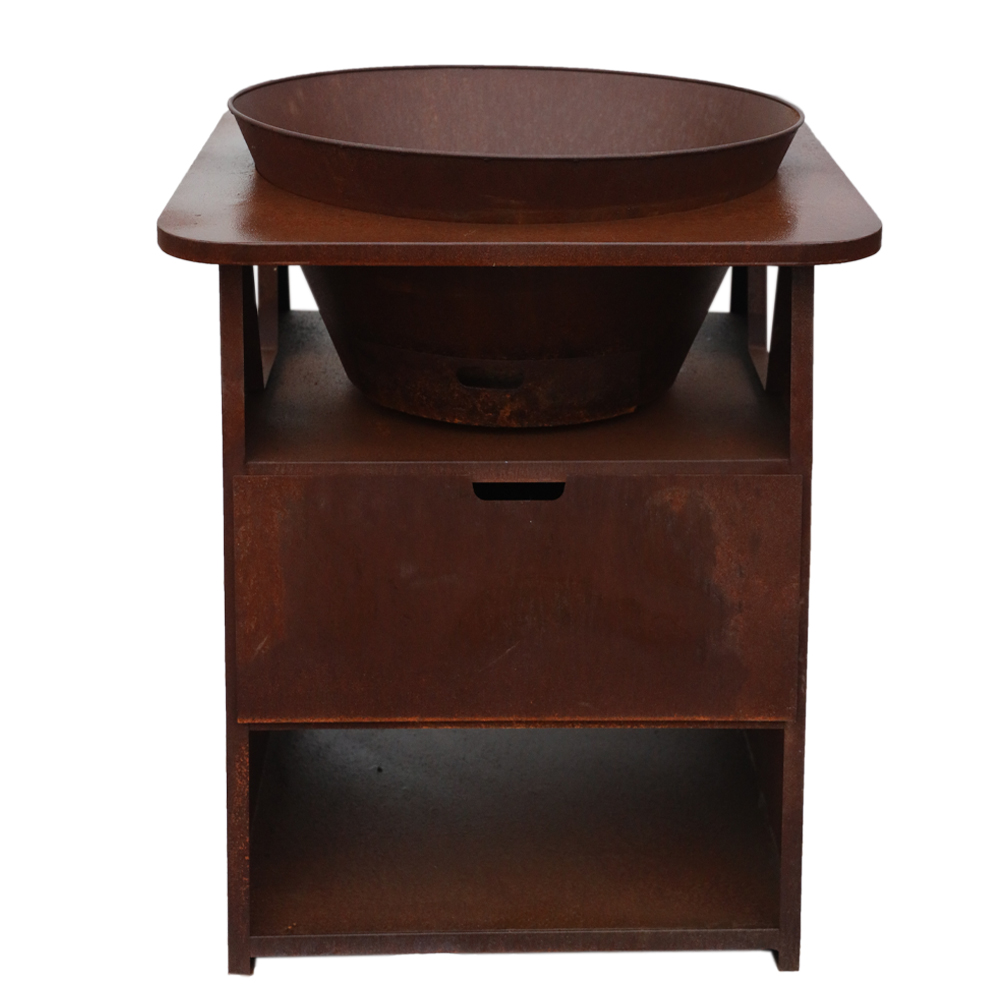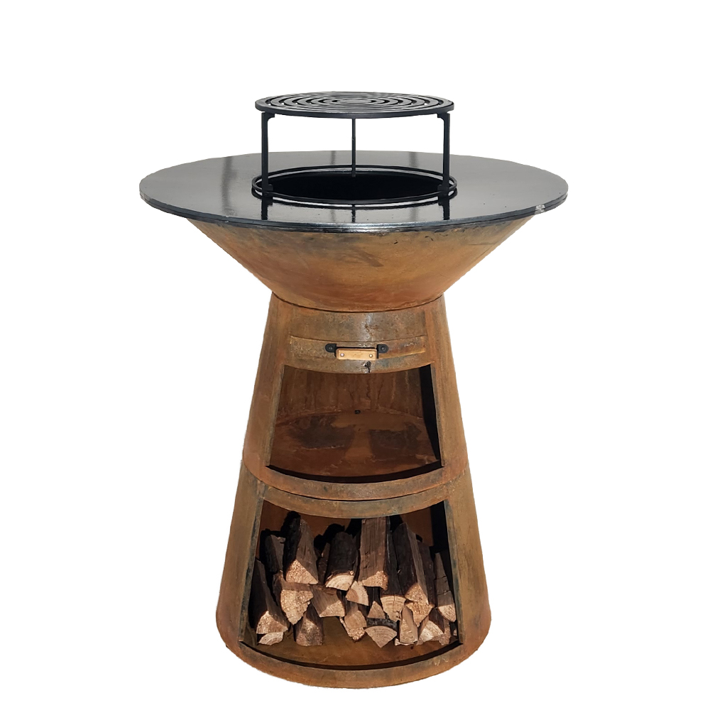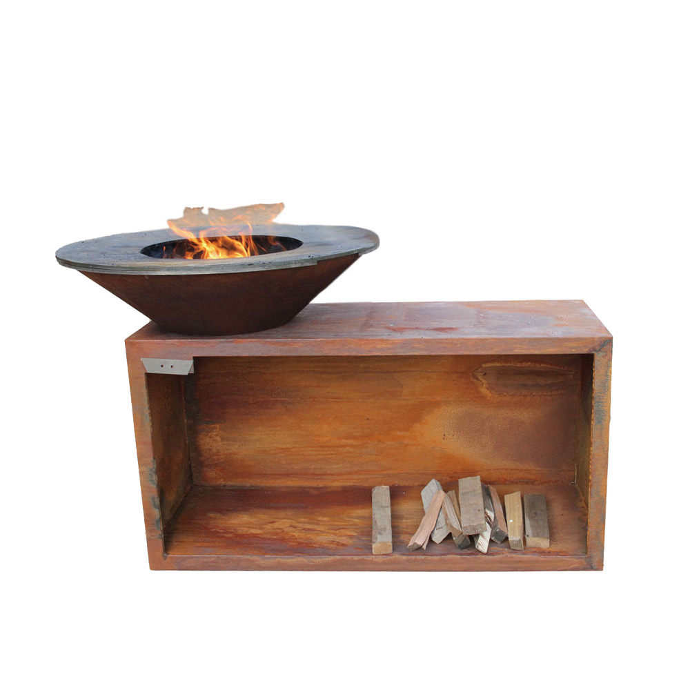 Rusty Corten steel cooking BBQ firepit with log storage for outdoor
