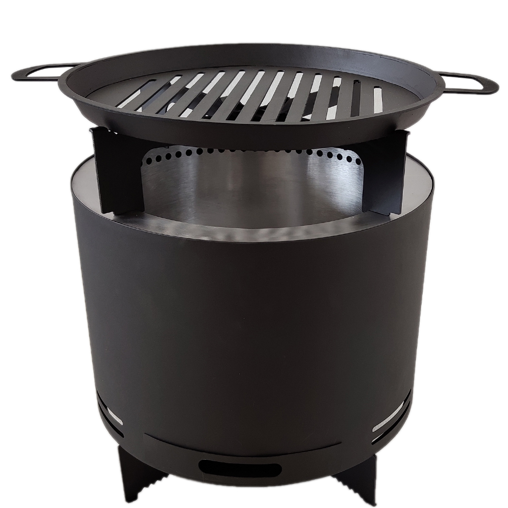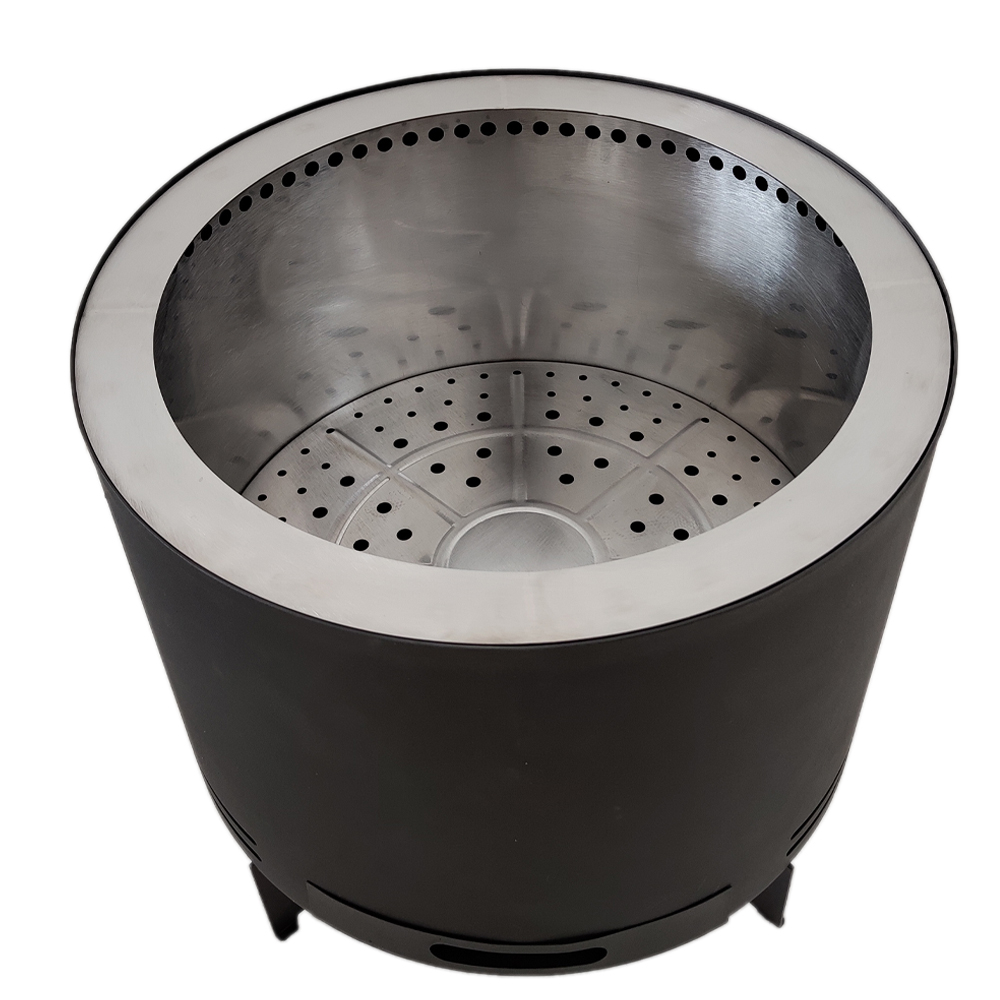 49 cm round smokeless fire pit, stainless steel inner layer, steel outer layer, with poker, ash tray, slot stand.