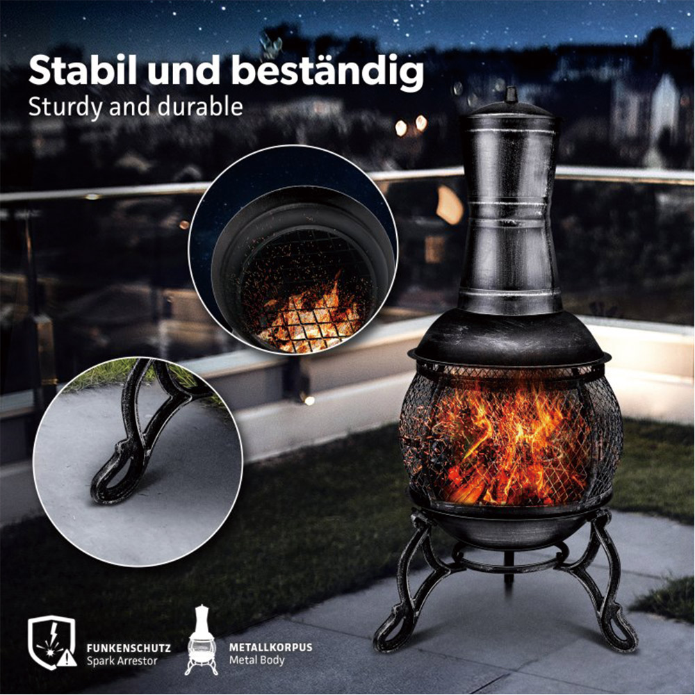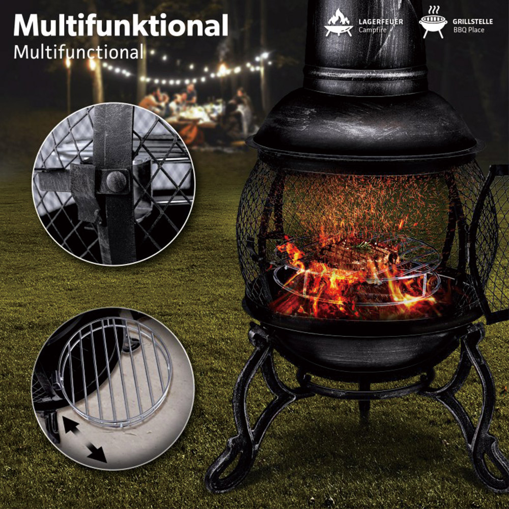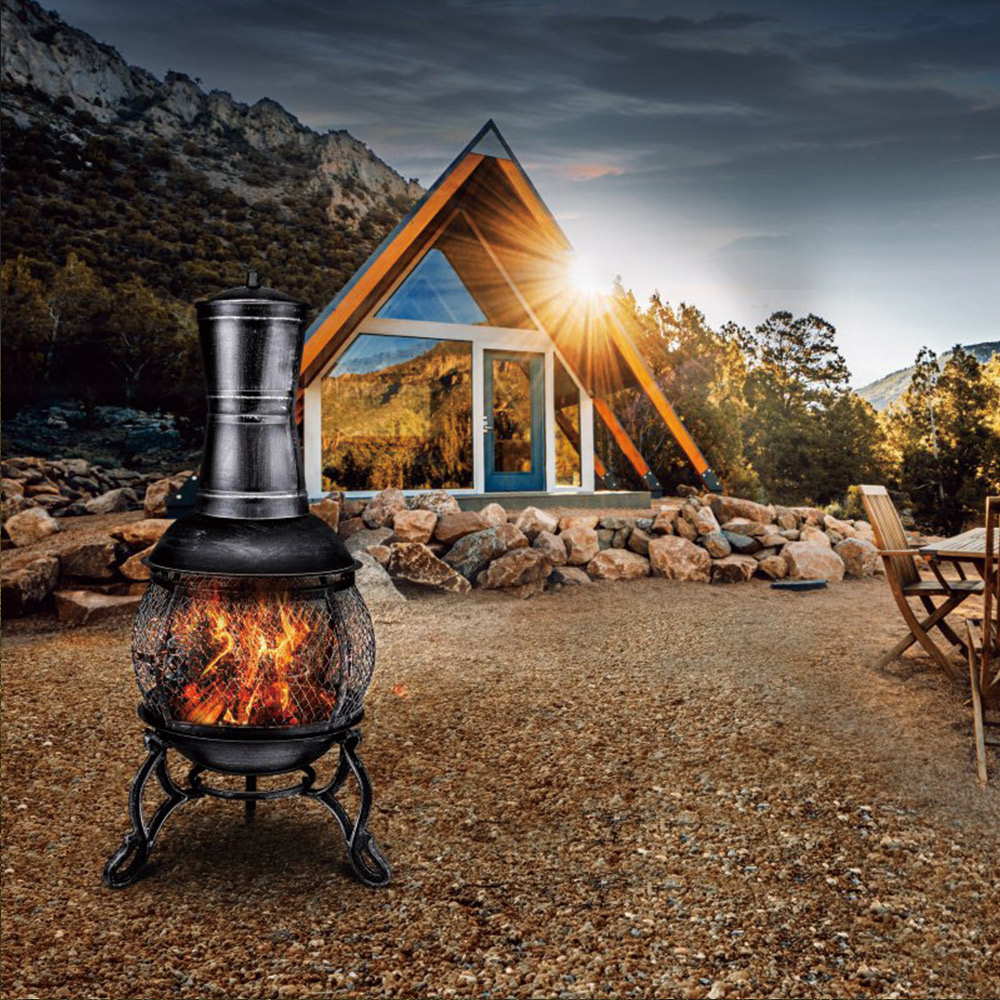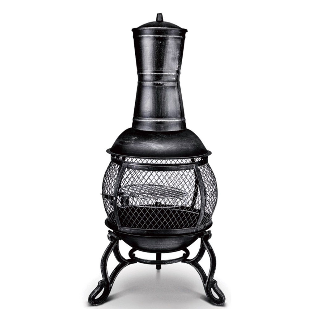 90cm H 1.2mm thickness steel chimenea with middle mesh,cast iron leg and stick grid, porker