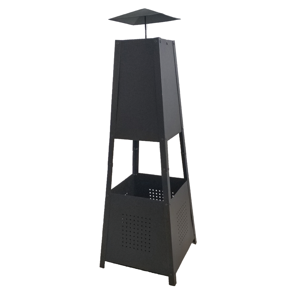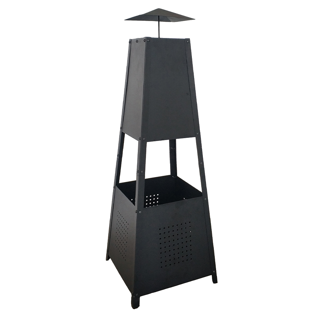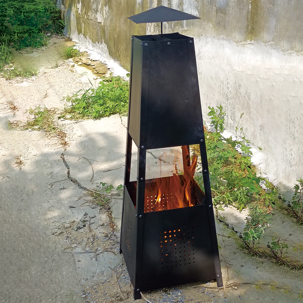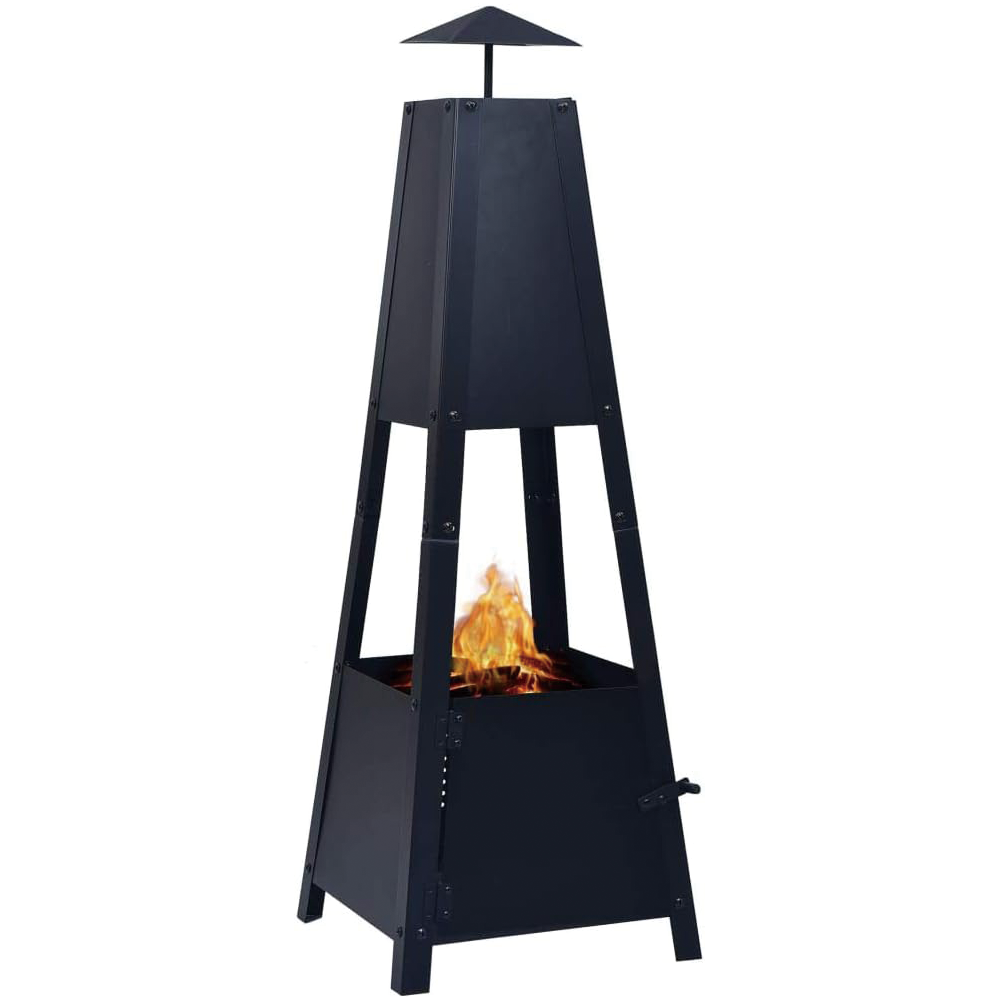"A modern, minimalistic garden chiminea. The chiminea fire pit works with both logs & charcoal to create the perfect atmosphere. Ideal for long summer evenings, the chimney fire pit has a black powder coating to keep it looking new & stylish for longer. Poker & log grate included.