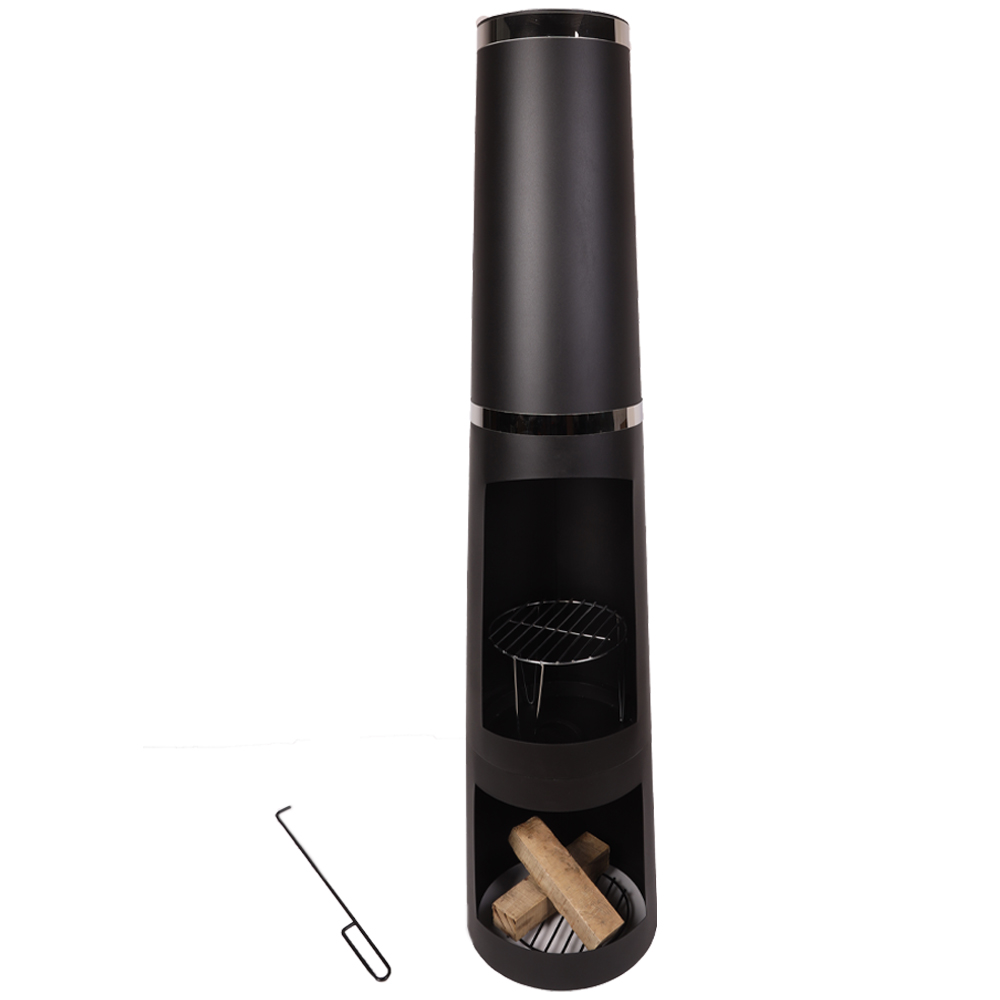 "A modern, minimalistic garden chiminea. The chiminea fire pit works with both logs & charcoal to create the perfect atmosphere. Ideal for long summer evenings, the chimney fire pit has a black powder coating to keep it looking new & stylish for longer. Poker & log grate included.