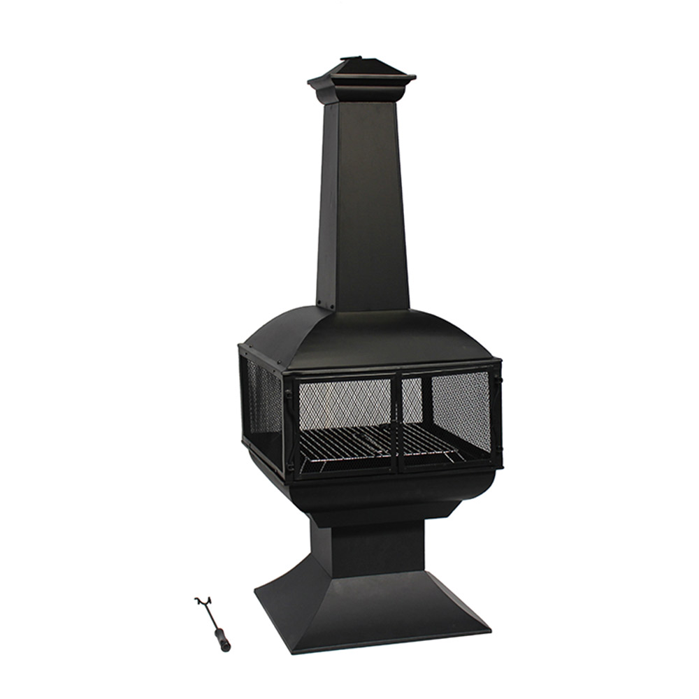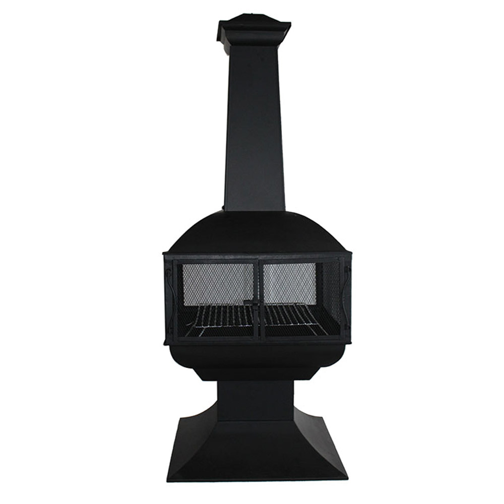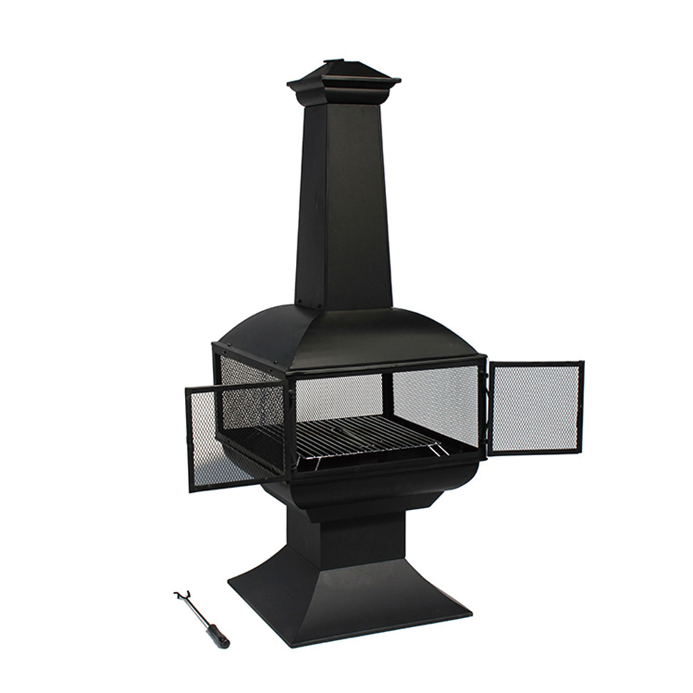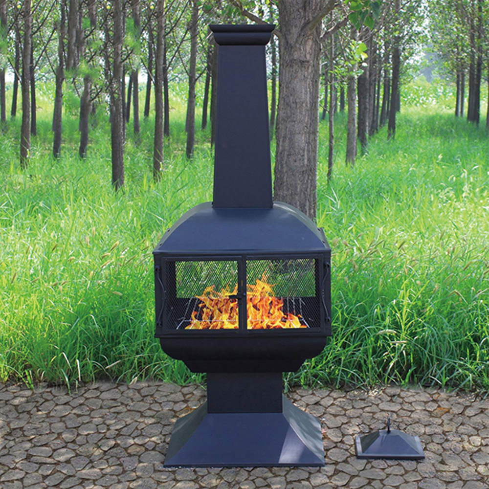 "Steel chiminea with a modern, minimalistic appearance. The backyard chimney fire pit has log storage, so your logs can remain close by. Large chiminea comes with a poker & log chiminea grate. Optional cover upgrade available to further protect your chiminea fire pit when not in use.