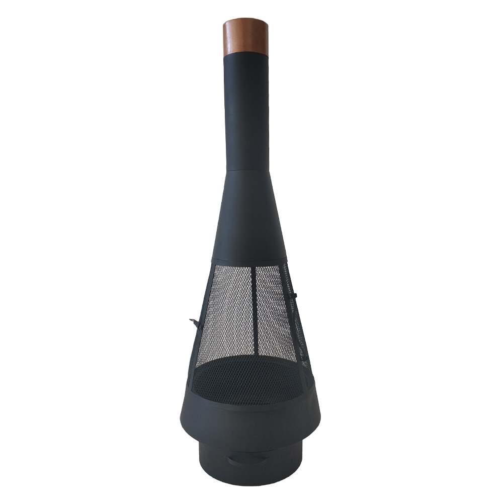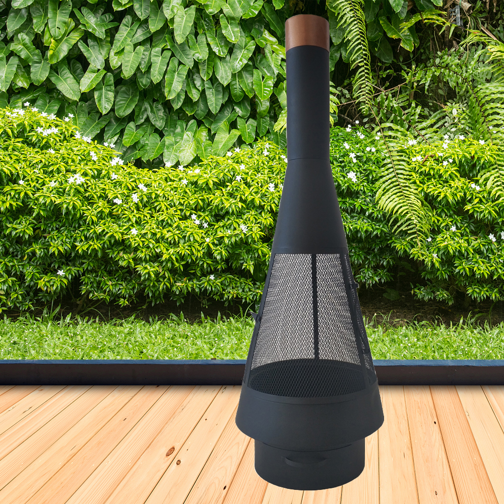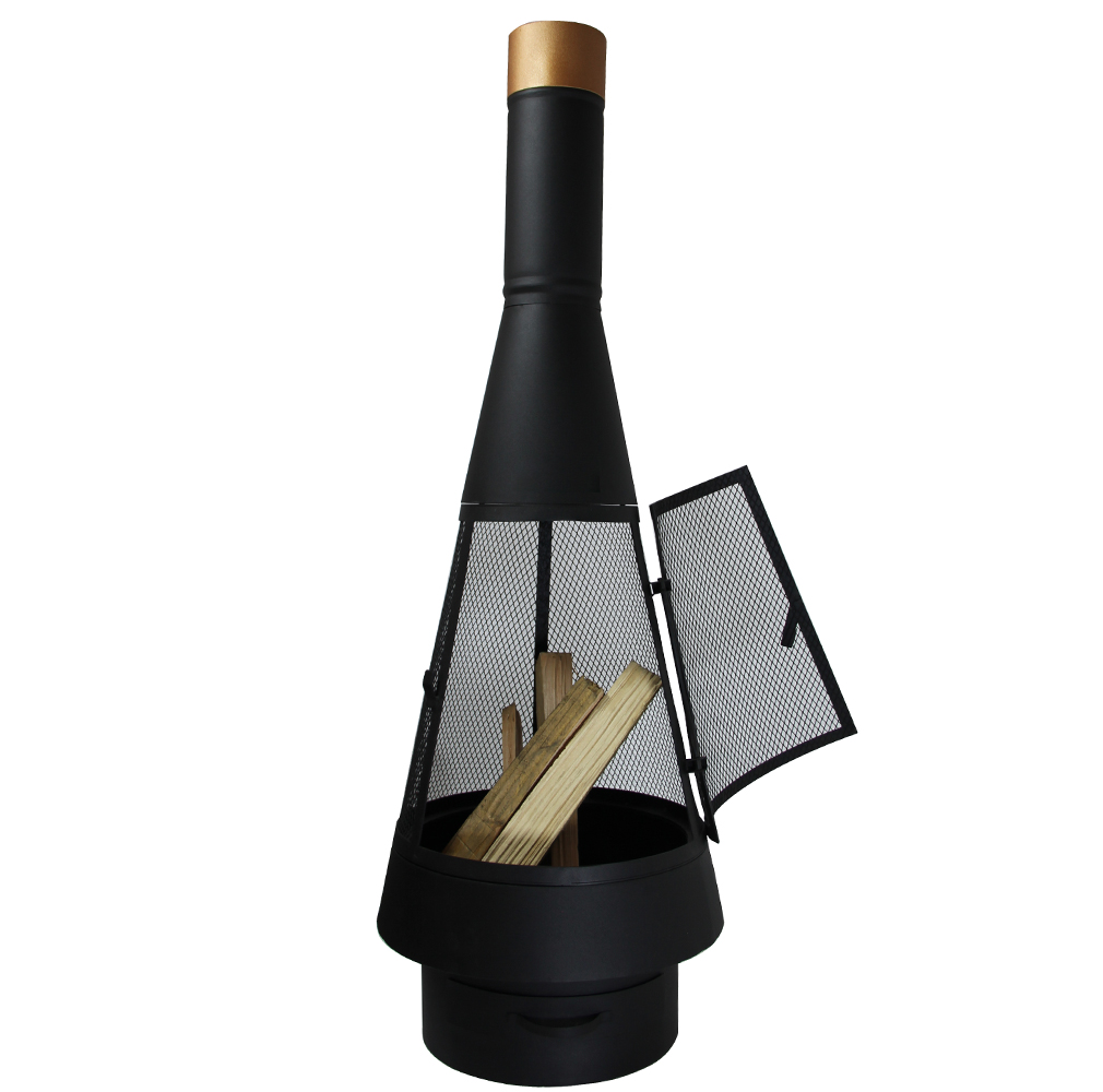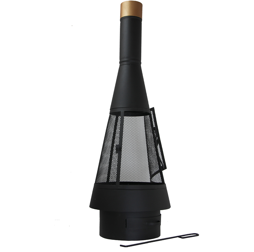 "Chiminea fire pit boasting a contemporary design. Backyard chiminea gives off heat in all directions thanks to its 360° design. The chiminea fire pit works with both logs & charcoal and comes with a poker & log grate included. Optional cover upgrade available.