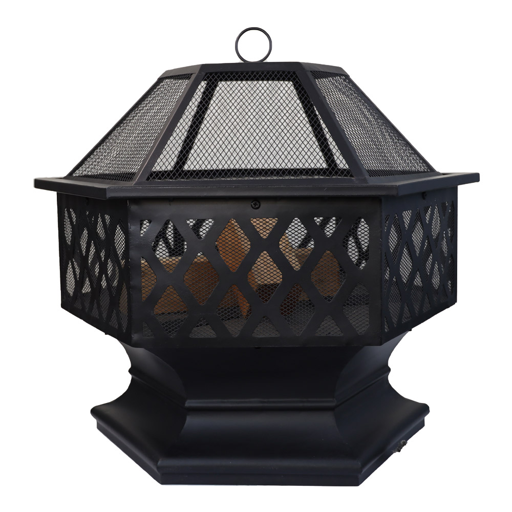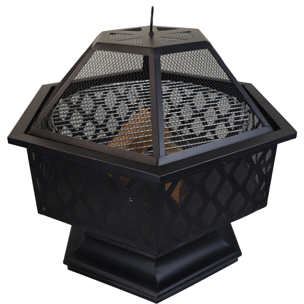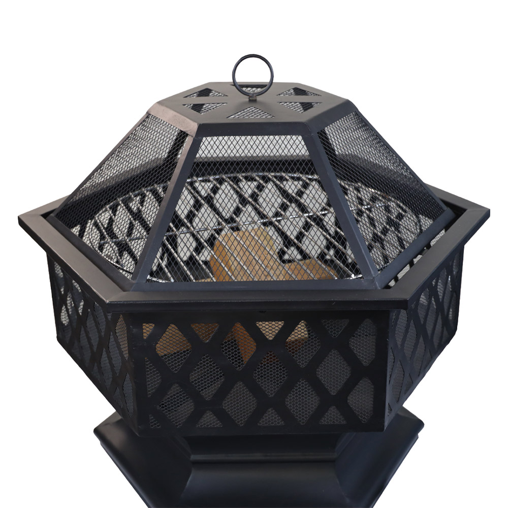 Hexagon steel fire pit with weave pattern, with stick grid, mesh cap, poker