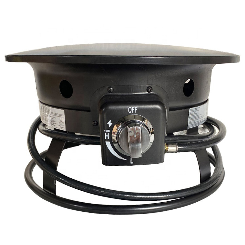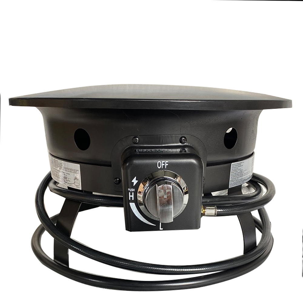 "19'' propane fire pit, with 304 Stainless steel burner, adjustable QCC fitting chromed knob and heat output of 58,000 BTU/HR.